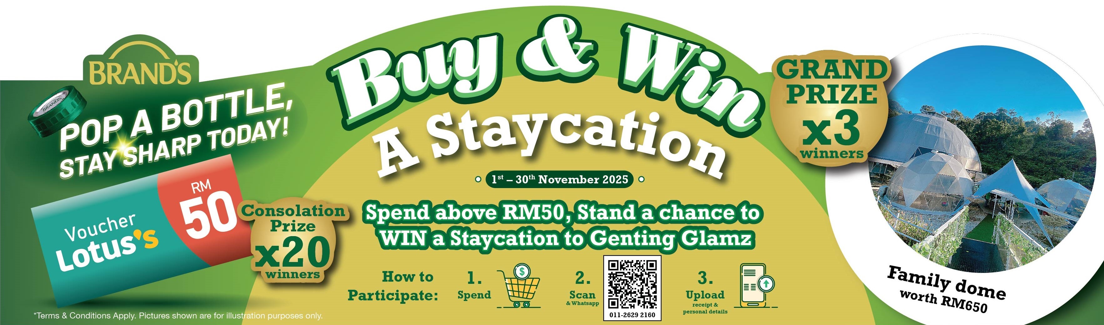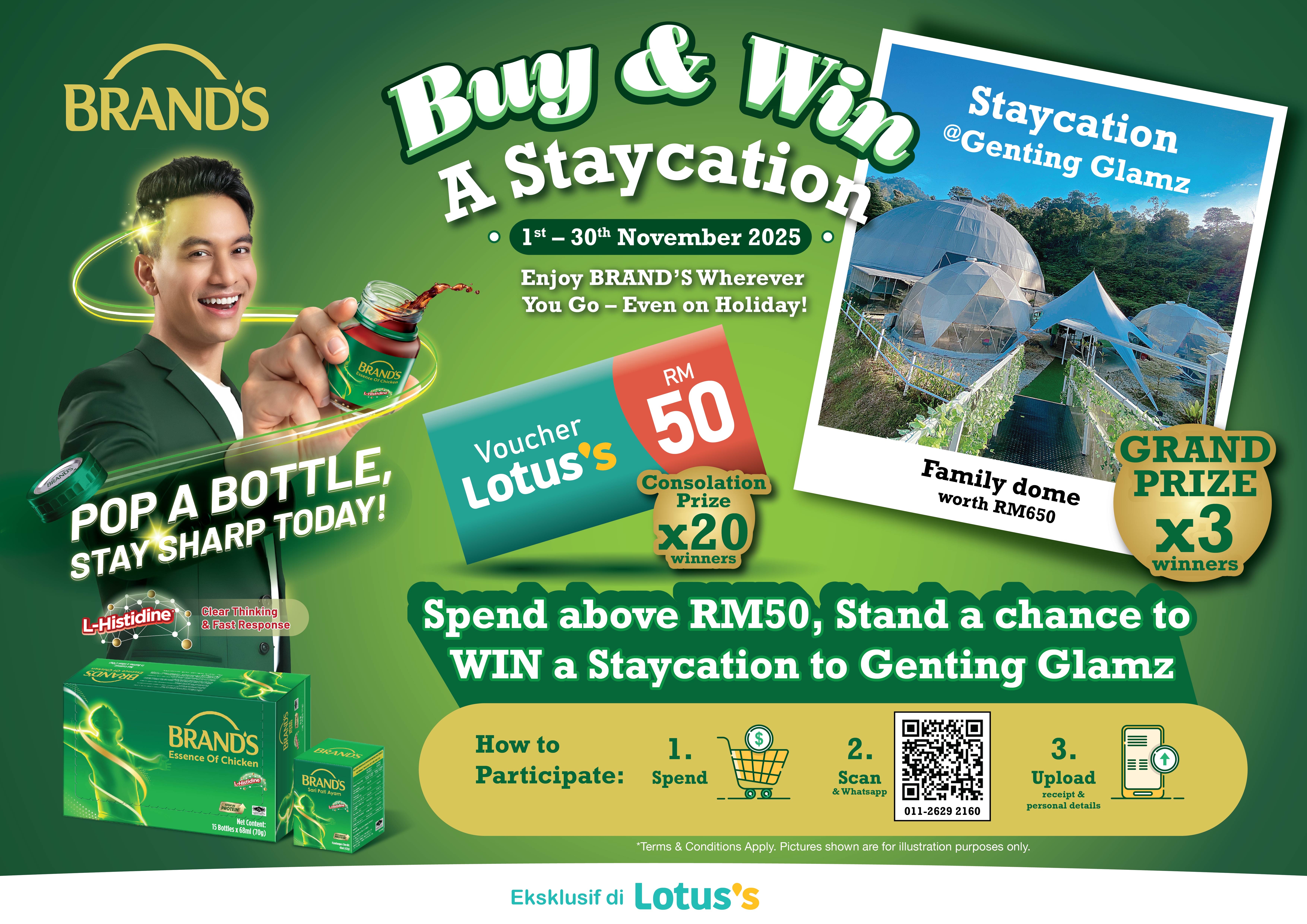 - Participants are eligible to participate in this Campaign with any purchase of BRAND’S® products worth RM50 and above from any Lotus’s in-store during this Campaign Period ("Proof of Purchase"). The original (printed) receipt indicating the date of purchase from 1st Nov 2025 to 30th Nov 2025 must be kept by the Participant for verification purposes (if necessary) and as Proof of Purchase.